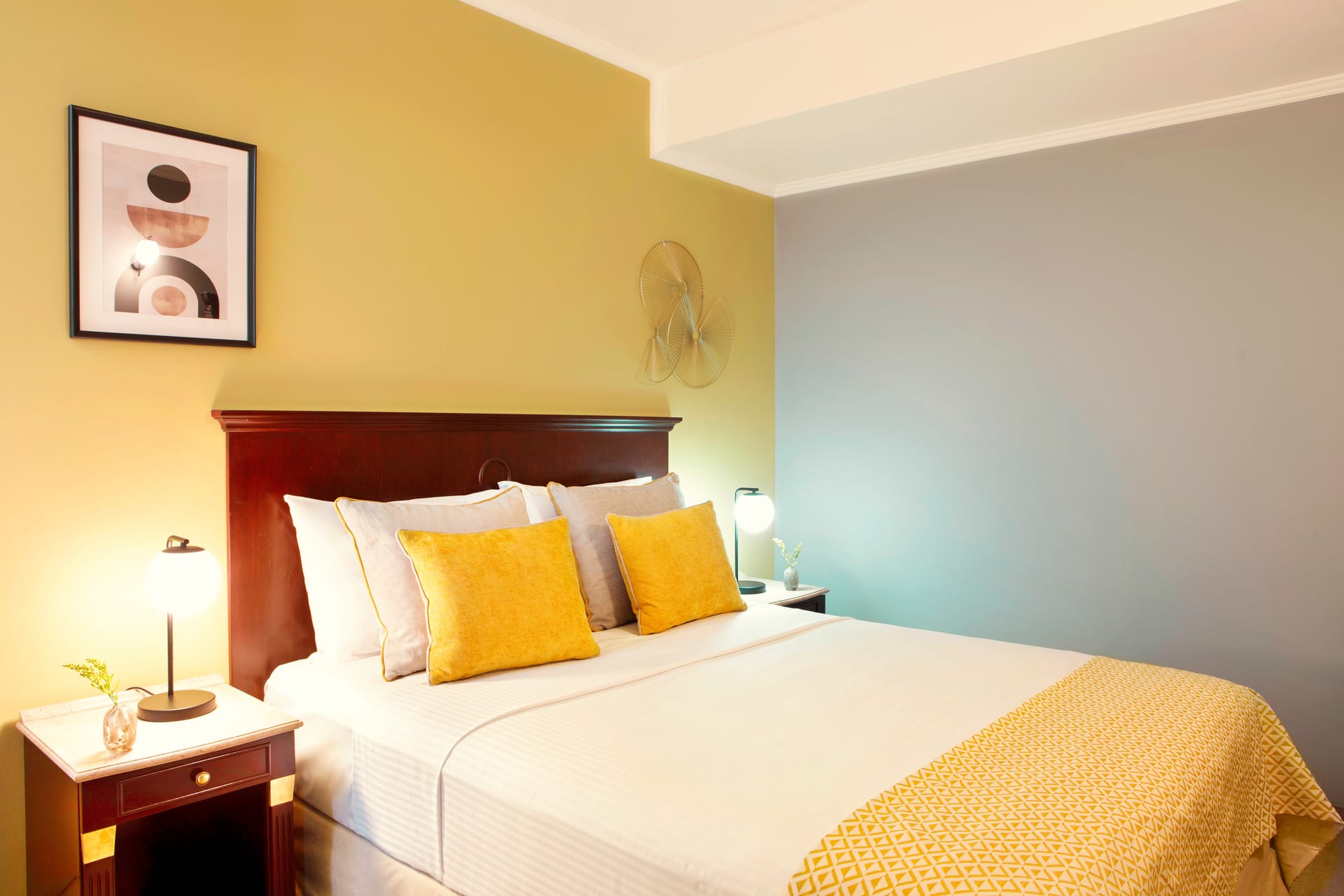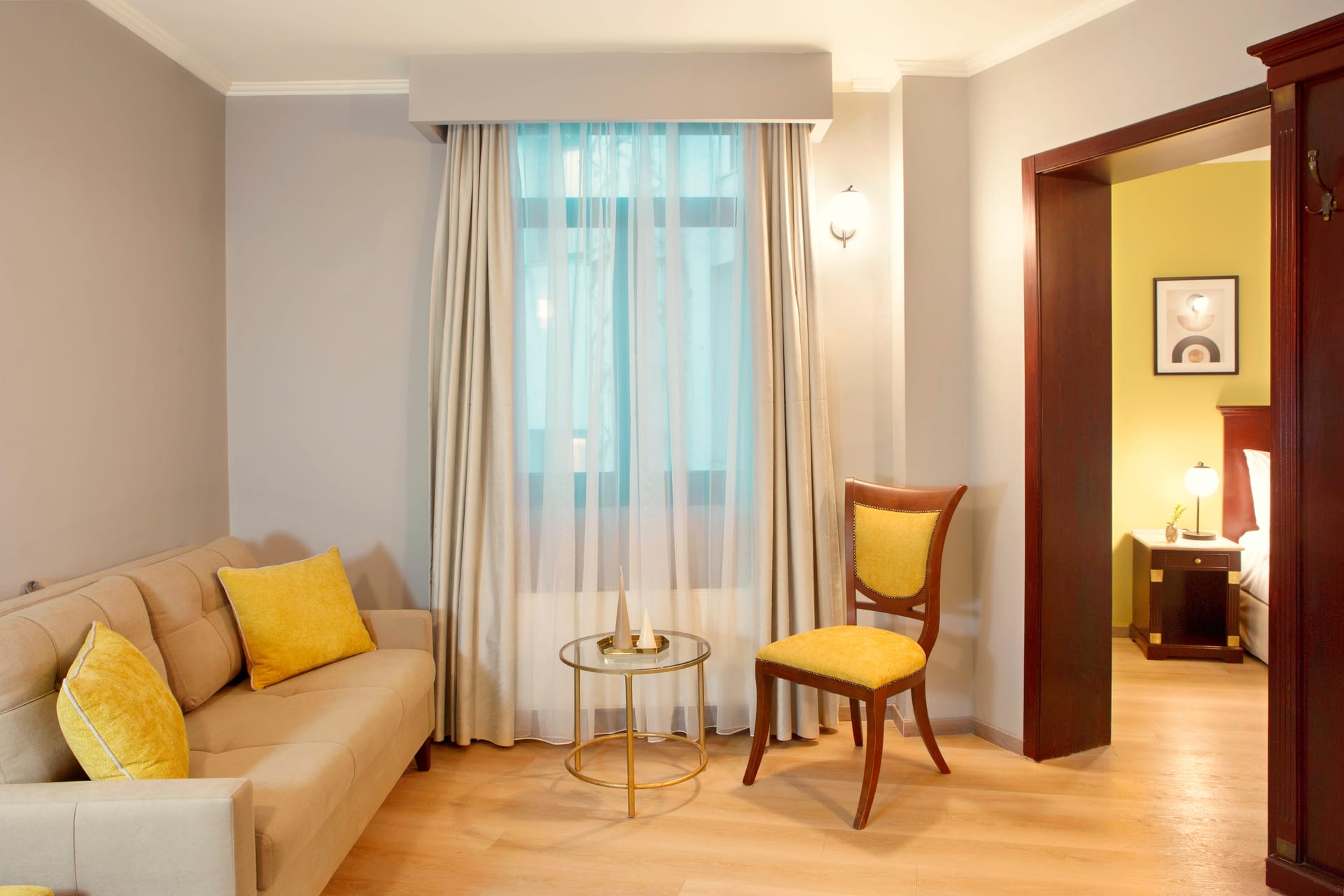 Welcome to a magnificent suite that puts you in touch with the old-world vibes along with today's living mode. A yellow and grey color schema adds a little more grace to the naturally enlightened spaces, while the antique décor takes you on a nostalgic journey. Moreover, a comfortable living area intensifies the relaxation feeling and heightens the welcoming ambiance of this suite.
